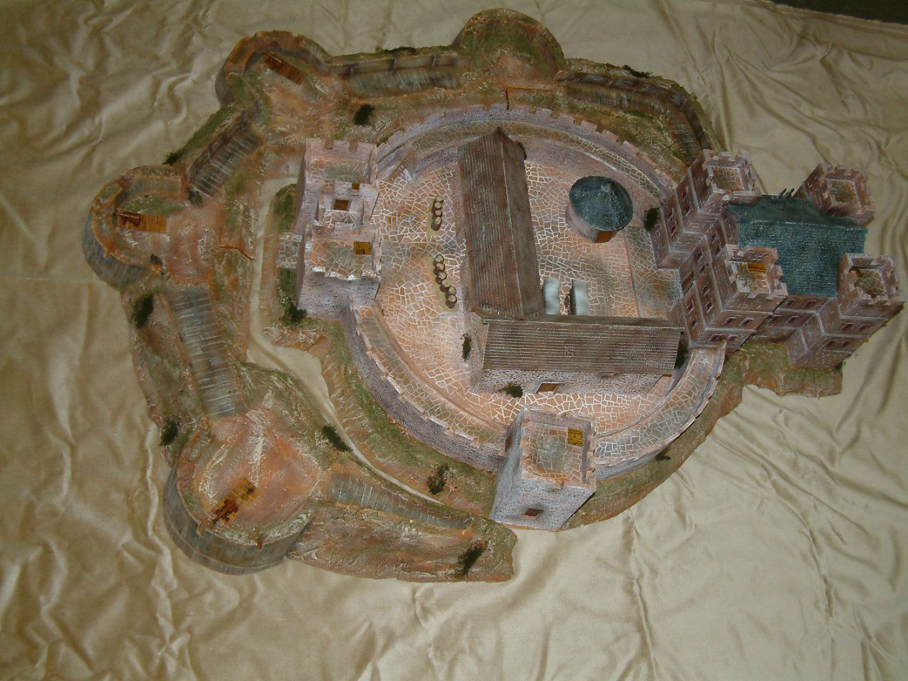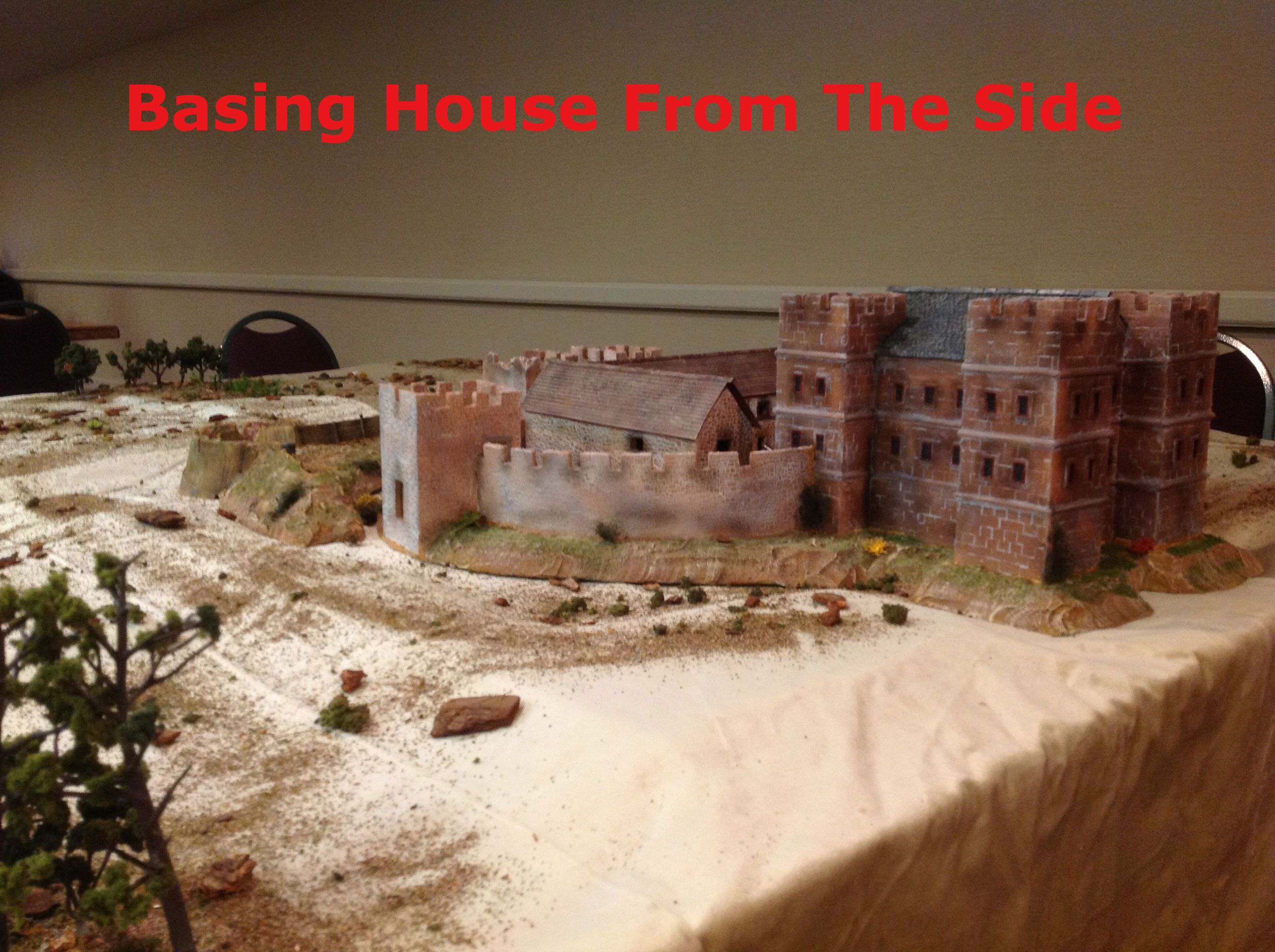Let me show you some of the parts of Basing House. First is an overhead view. On the right is the multiple story manor house which looks more like a keep. In front of the manor house are barracks and store rooms. One of the storerooms is round. I had to drastically reduce the interior of the fortifications to make the setting usable.