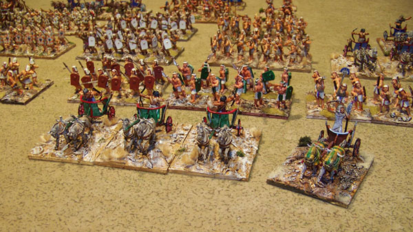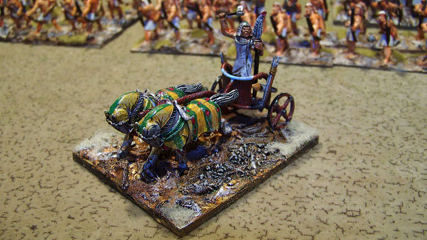 Left is a vizier unattached to his divisional chariots. I prefer not to use such large units; using them in pairs each with a unit commander. I like the smaller units as they have greater mobility. By using smaller units I have more chances of shooting-yes more rolls but statistically if you roll like I do you will need as many chances as possible. This also gives your opponent more targets but this distributes the casualties and takes more time to destroy these very valuable elements of the army.